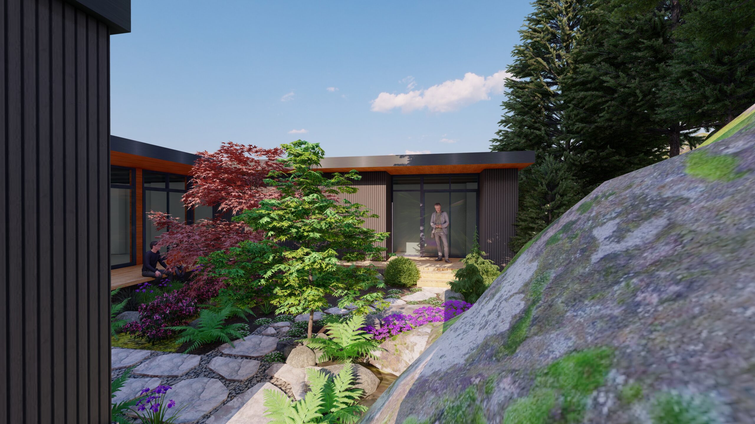 This Japanese-inspired courtyard design emphasizes tranquility and balance. The space features carefully selected materials, strategic plantings, and a minimalist aesthetic that invites quiet contemplation and peaceful enjoyment of the outdoor environment.